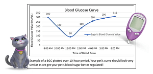 Blood Glucose Curves (BGC) are a common preliminary tool used to assess the effectiveness of your pet’s insulin. They help to determine if adjustments need to be made to the amount of insulin being given. BGC are utilized as an early assessment method as they give a very quick snapshot of how your pet is doing. They do not require your pet to be on a set insulin dose for an extended period (usually only 7 days). This allows your vet to make small, frequent changes in your pet’s insulin as we work to get your pet to a well-managed blood glucose range.